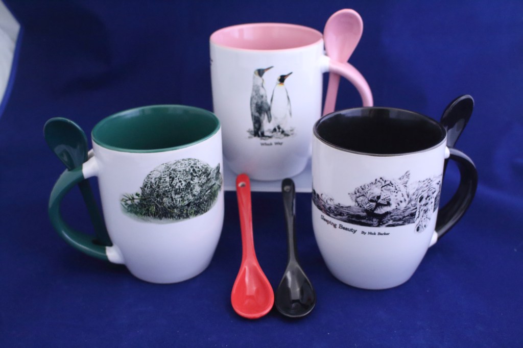 Mug and Spoon £8 (various designs) Red, Light Blue, Black, Blue, Pink, Green