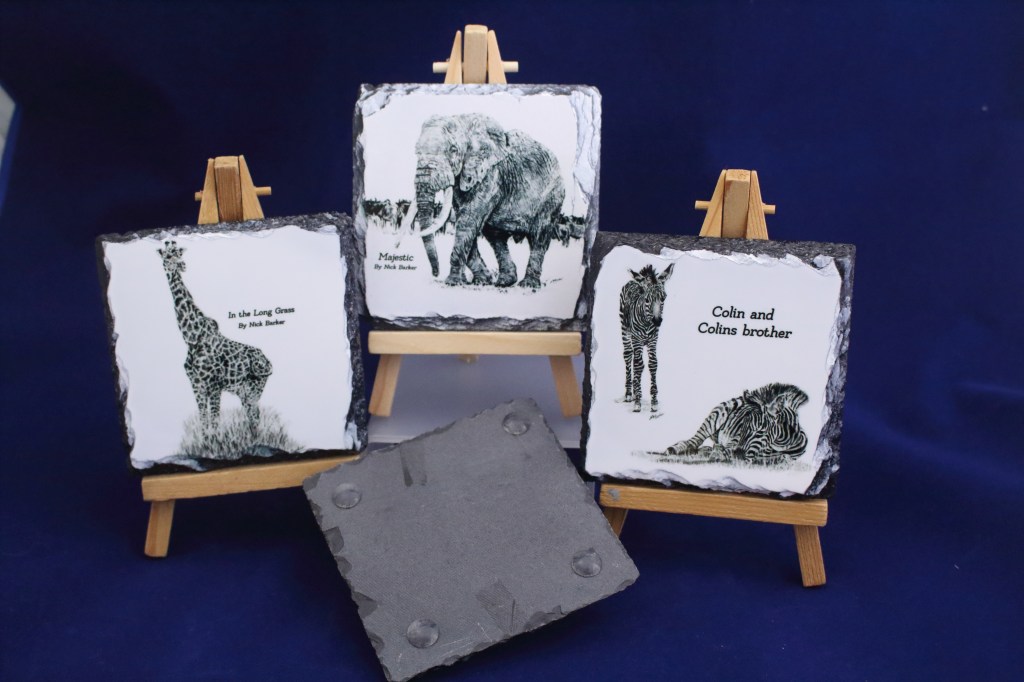 Slate Coasters £5 (Stand £1 extra) Set of any four Slate Coasters £18